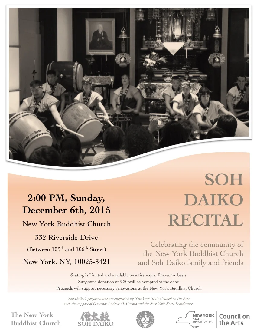 To celebrate our ongoing connection with this community, Soh Daiko is pleased to put on a recital in the Hondo for the public, with suggested donations to directly benefit the New York Buddhist Church. This is a chance to see us perform before our spring performance season, see the progress of our trainees, and showcase the NYBC children's taiko class, taught by Soh Daiko alumnus and legend, Teddy Yoshikami. This concert is the second of what we hope to be an annual showcase of works in our home for our closest fans.